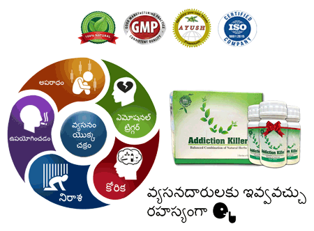 Addiction Killer ఒక హెర్బల్ ఆయుర్వేద ఔషధం, ఇది స్మోకింగ్, డ్రింకింగ్ వంటి ఏవిధమైన వ్యసనానికి అయినా చికిత్స చేయగలదు.